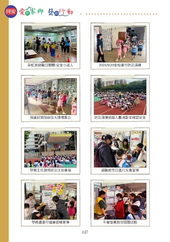 愛我家鄉 藝起行動我家鄉 藝起行動 愛 彩虹班親職日闖關-安全小達人 2024/9/20全校進行防災演練 保護好頭部前往大操場集合 防災演練班級人數清點並確認安全 學務主任說明防災注意事項 親職教育日進行反毒宣導 學務處進行健康密碼宣導 午餐營養教育闖關活動 127